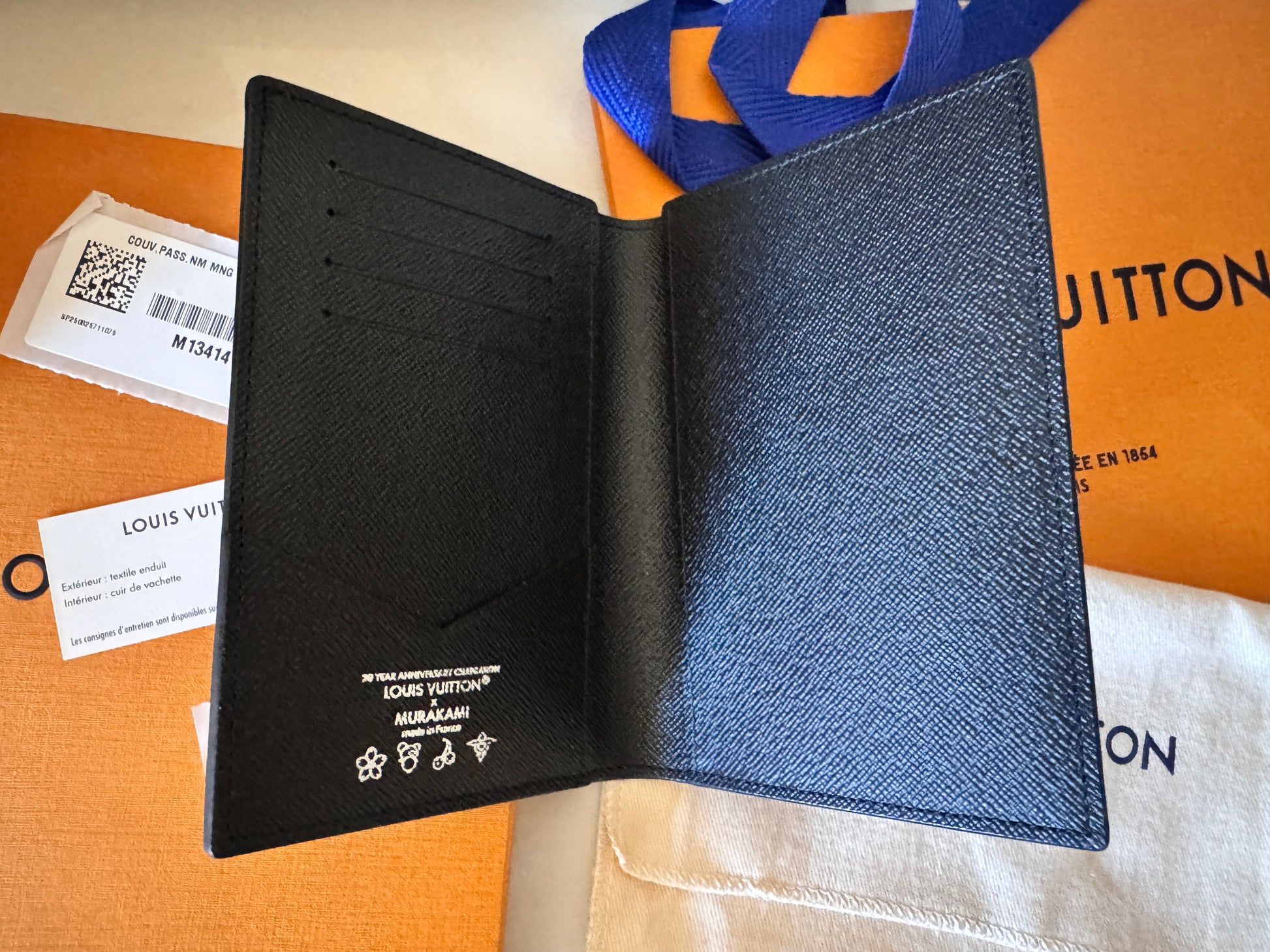 The product is a stylish and luxurious 2025 Louis Vuitton Murakami Passport Cover in black. Crafted from leather with a canvas fabric type, this one-size cover features the iconic logo theme and credit card slots. Perfect for anyone looking to add a touch of high-end fashion to their travel essentials, this authentic Louis Vuitton accessory is a must-have for anyone.