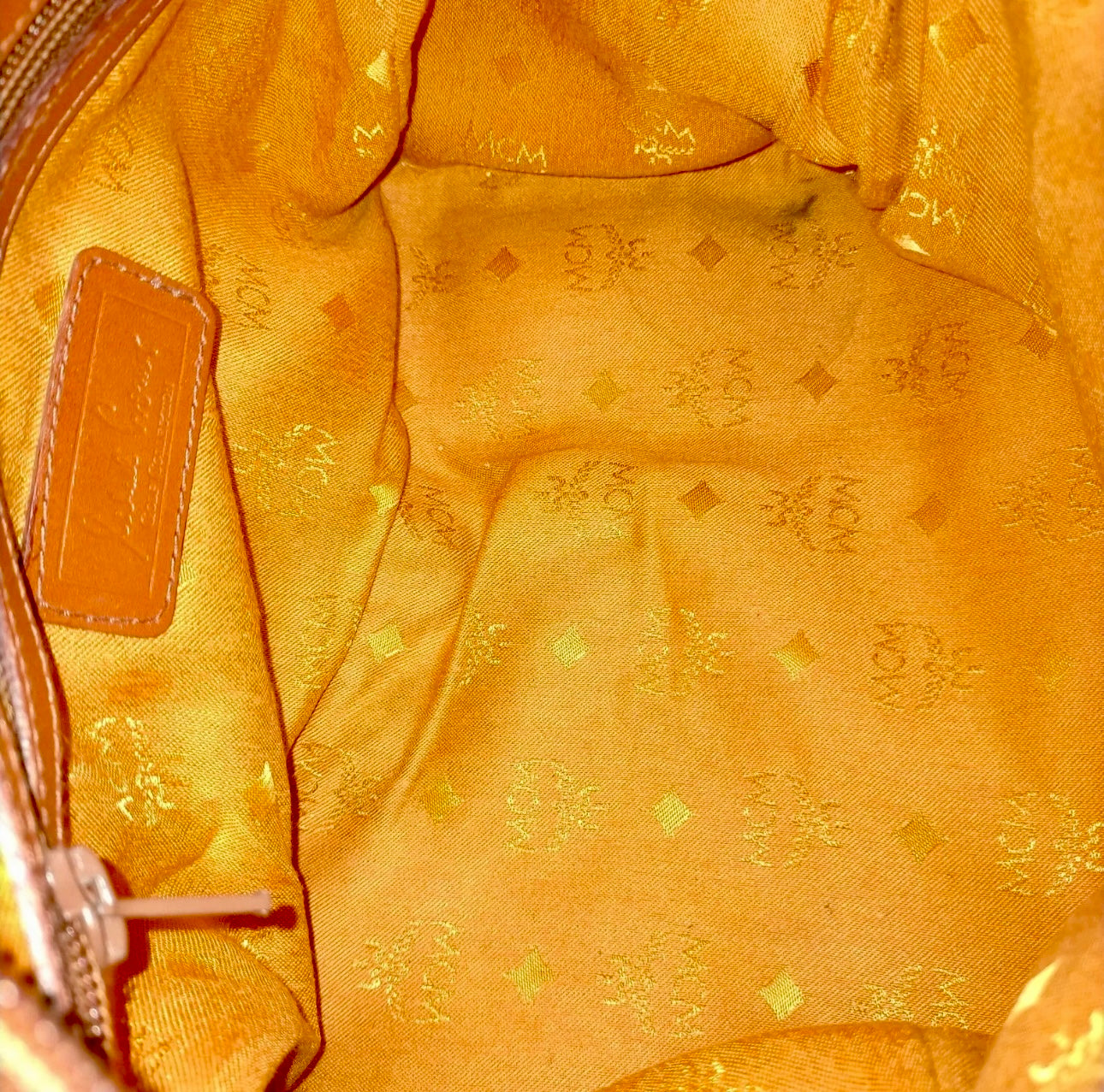 The MCM Cognac Visetos Leather Handbag is a medium-sized rectangle-shaped handbag made with PVC, leather, and leather materials. It features a zip closure, gold hardware accents, and double brown leather handles with a 3.94-inch drop. The interior includes inner pockets, a brown leather and fabric lining, and is part of the MCM Cognac product line. Designed for women, this designer handbag from Germany also comes with a detachable strap, making it a versatile and stylish accessory for any outfit.