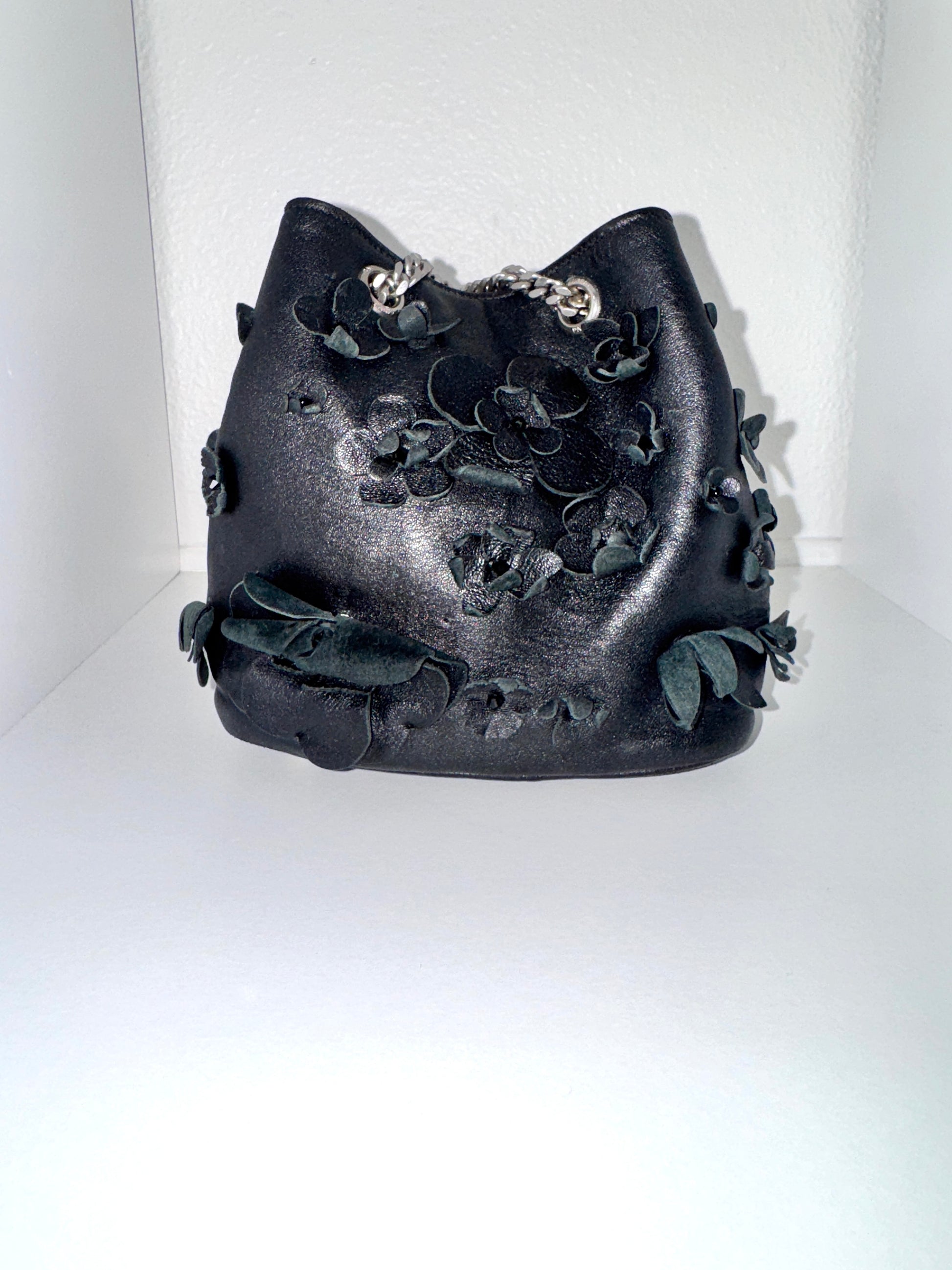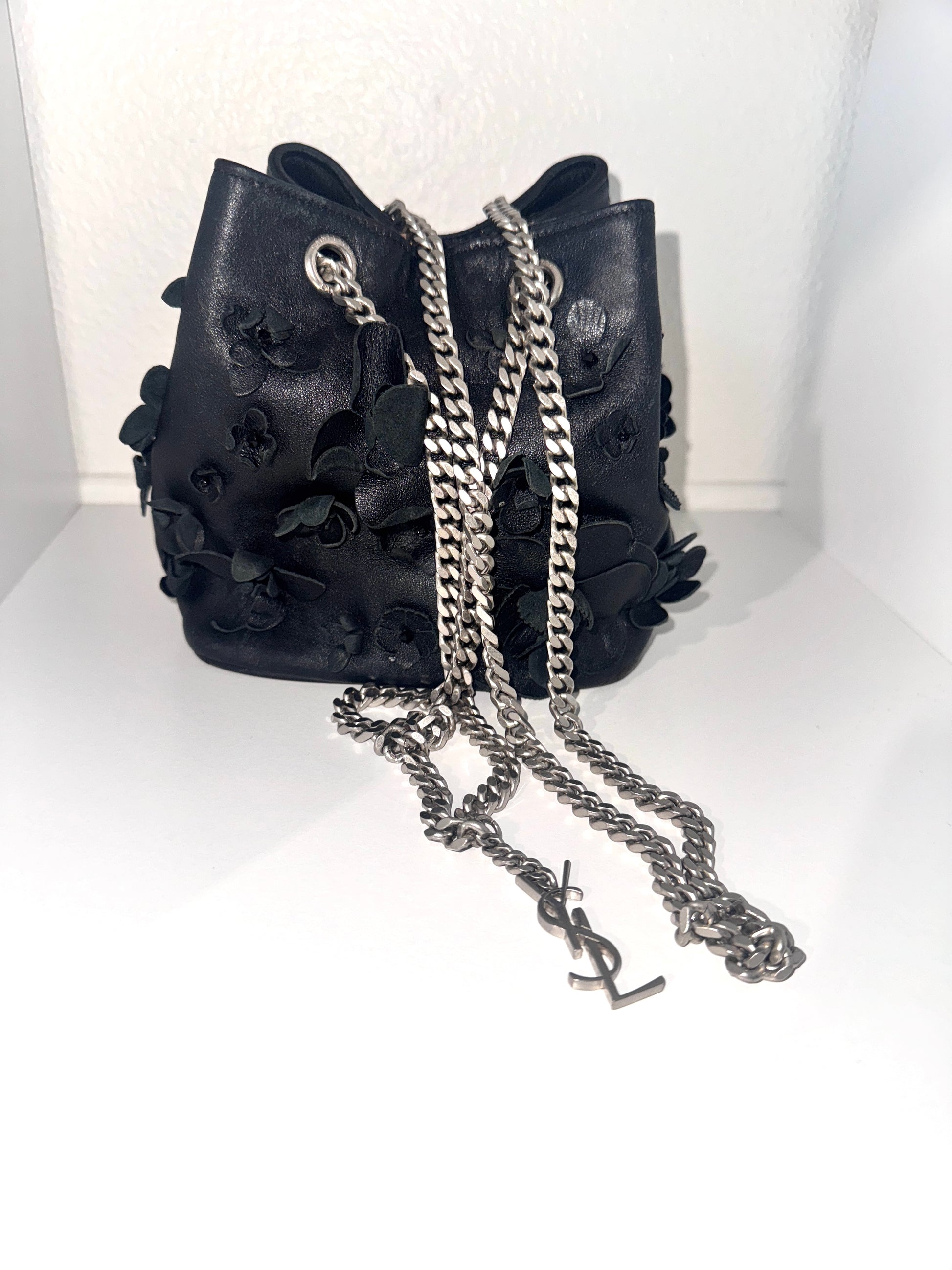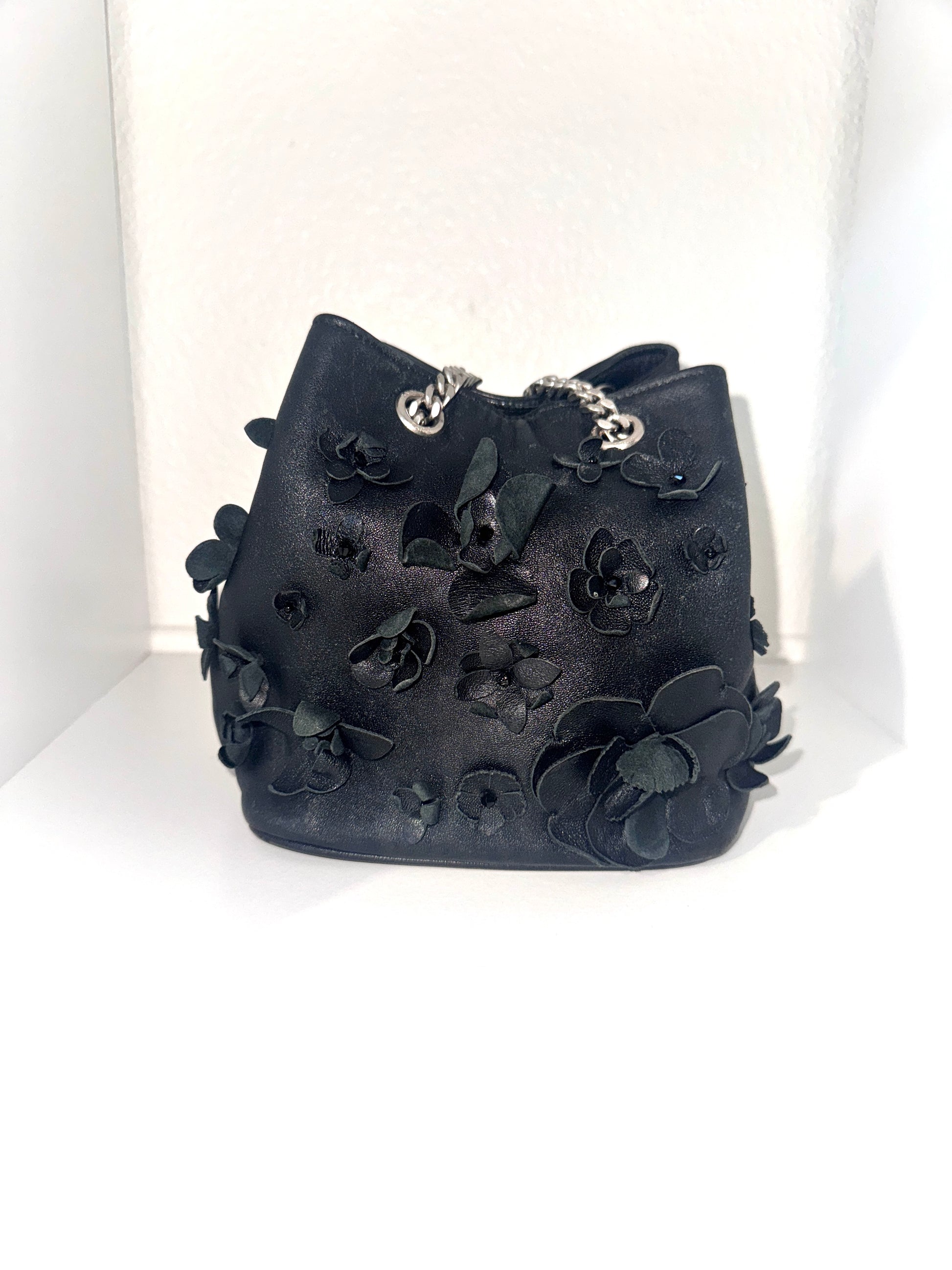Saint Laurent Lambskin Floral Applique Baby Emmanuelle Bucket Bag Black